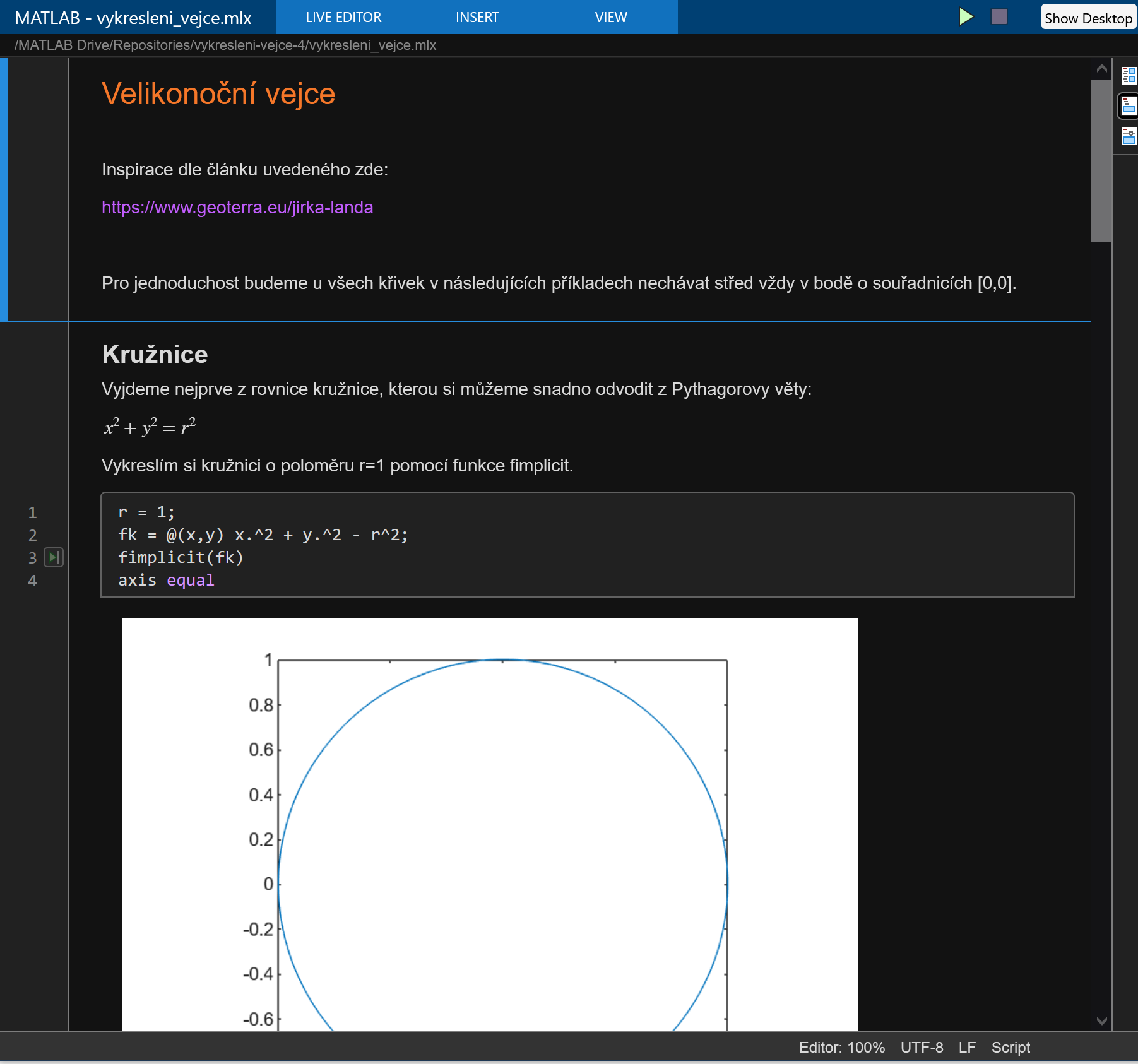 Pro zpřístupnění Live Scriptu široké komunitě jej můžete sdílet přes GitHub nebo MATLAB File Exchange. GitHub a File Exchange lze snadno propojit, takže stačí spravovat Váš kód na jednom místě, ale přístupný je z obou platforem. GitHub lze také propojit se Zenodo či Figshare pro dosažení archivace a vytvoření DOI. Po nasdílení vašeho výzkumu na GitHub k němu vygenerujte tlačítko „Open in MATLAB Online“. Kdokoliv pak snadno může jedním klikem Váš kód otevřít a spustit v MATLAB Online. Samotné zpřístupnění ještě nezajistí reprodukovatelnost. Pro reprodukovatelnost Vašeho výzkumu je možné vytvořit docker kontejner, který bude obsahovat vše potřebné pro jeho opakovatelné spuštění, či využít některý z portálů pro reprodukovatelnost, např. Code Ocean, který kontejner vygeneruje za Vás, zajistí jeho archivaci a vygeneruje DOI.